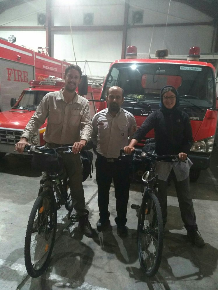 Le voyage comporte bien sûr son lot d’imprévus et de « désaccords » (entendez franches engueulades). Comme cette journée entre Kashan et Qom, où nous ne parvenions pas à nous entendre sur le lieu où s’arrêter. Pour arriver finalement à Qom, grande ville d’un million d’habitants à 20h le soir en espérant trouver un parc où poser la tente tranquillement. Hum, hum… plus facile à dire qu’à faire. Tous nos informateurs nous répondent différament et contredisent l’informateur questionné précédemment. Nous errons un peu jusqu’à qu’Adrien décide de demander notre chemin à des pompiers.